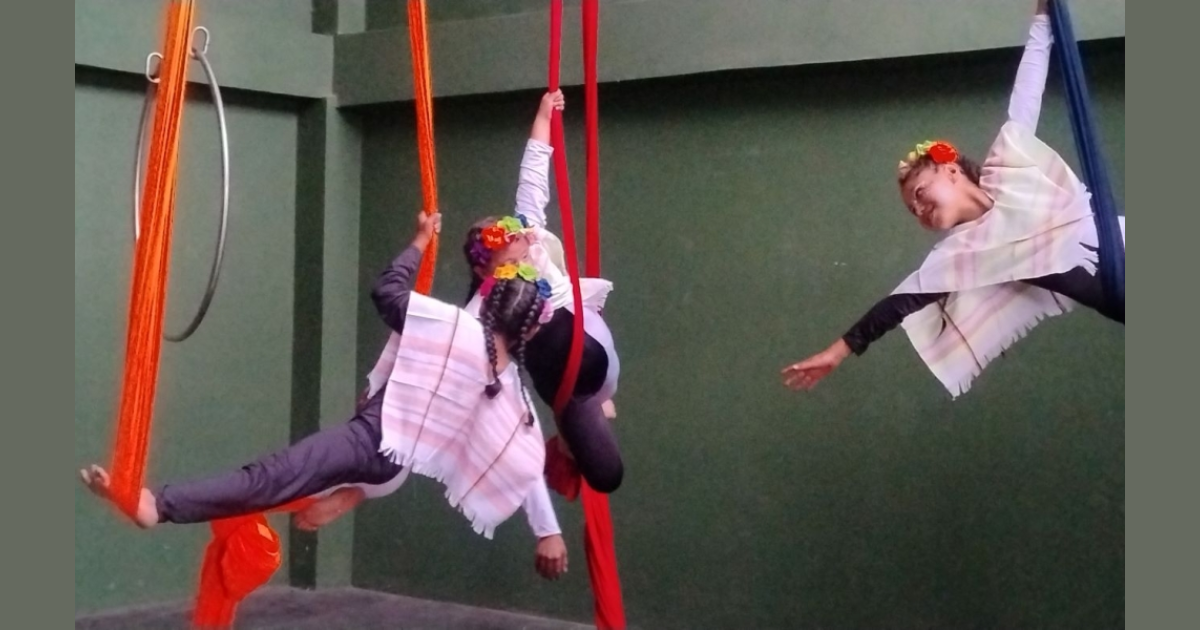 Imagen de dos marabaristas pendiendo de cuerdas de una mano y un pieFoto: Idartes.
