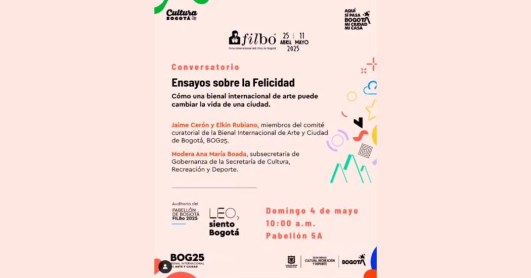 ¡Bogotá, mi Ciudad, mi Casa es literatura y cultura! La Secretaría de Cultura, Recreación y Deporte (SDCRD), en el marco de la Feria Internacional el Libro de Bogotá 2025 (FILBo), te invita a la charla: 'Bogotá, Ensayos sobre la Felicidad' en la que se verá cómo una bienal internacional de arte puede cambiar la vida de una ciudad. Este evento se realizará en el Pabellón 5A, 'LEO, Siento Bogotá', el domingo 4 de mayo, a las 10:00 a. m. ¡Entrada con boletería!
