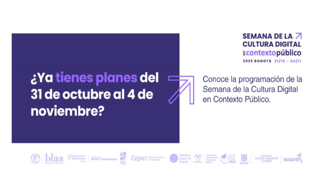Brian Hettler, Director de proyectos de mapping en Amazon Conservation Team 9:00 a 10:10 a.m. en el Auditorio del Museo de Arte Miguel Urrutia, MAMU - Banco de la República, calle 11 #4-21 ¿Cómo son esas nuevas formas de mediación de las colecciones culturales en el contexto de la Cultura Digital? ¿Cómo pueden utilizarse herramientas digitales para contar las historias que hay en ellas? Estas y más preguntas orientan la programación de la Semana de la Cultura Digital en Contexto Público, que se propone como un espacio abierto de encuentro y reflexión entre los públicos, mediadores culturales, maestros, estudiantes e investigadores académicos en Bogotá, Colombia. Este evento reúne los esfuerzos de tres entidades de la ciudad: la Red Distrital de Bibliotecas Públicas - BibloRed, de la Secretaría de Cultura, Recreación y Deporte, la Biblioteca Luis Ángel Arango, la Red de Bibliotecas del Banco de la República, y el Centro de Estudios en Periodismo de la Facultad de Artes y Humanidades de la Universidad de los Andes.
