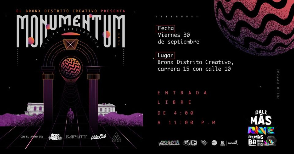 El evento es apoyado por Kapput, Octava y Videoclub, tres de los principales clubes de Bogotá, y contará con la presentación especial de Ácido Pantera. Monumentum Fiesta Electrónica ha sido diseñada y producida por el Bronx Distrito Creativo, lo que lo convierte en un proyecto público pionero en la realización de eventos de música electrónica en la ciudad. vibraremos con Nuclear Digital Transistor, Kabinett, Kat Yusti, Julián Gómez, Casssti, Niebla, Álex Bessofen y Pablo Arbeláez.