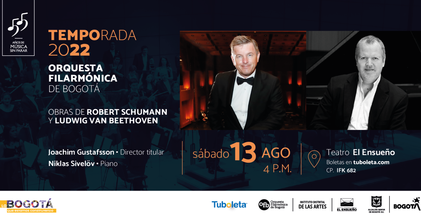 Orquesta Filarmónica de Bogotá Director Titular: Joachim Gustafsson Solista: Niklas Sivelöv – Piano - Robert Schumann (1810-1856) Obertura, Scherzo & Final, Op. 52 (1845) - Ludwig van Beethoven (1770 – 1827) Concierto para violín, Op. 61, (1807) Versión para piano del compositor I. Allegro ma non troppo II. Larghetto III. Rondo