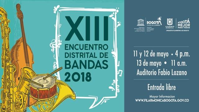 El Encuentro Distrital de Bandas, evento liderado por la Orquesta Filarmónica de Bogotá, llega este año a su XIII edición en el Auditorio Fabio Lozano, los días 11, 12 y 13 de mayo, se vivirá la fiesta propia de este formato.