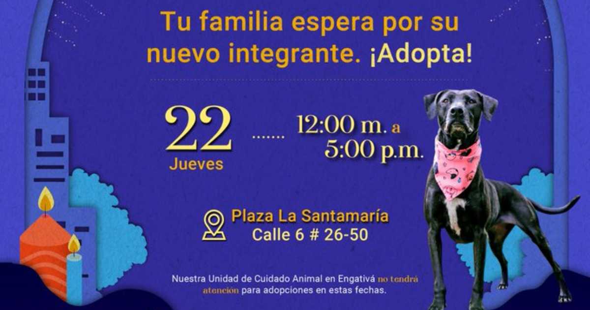 Ven este 22 de diciembre a la plaza La Santamaría de Bogotá, desde las 12 del medio día hasta las 5 de la tarde y participa en esta jornada de adopción de animales de compañía.