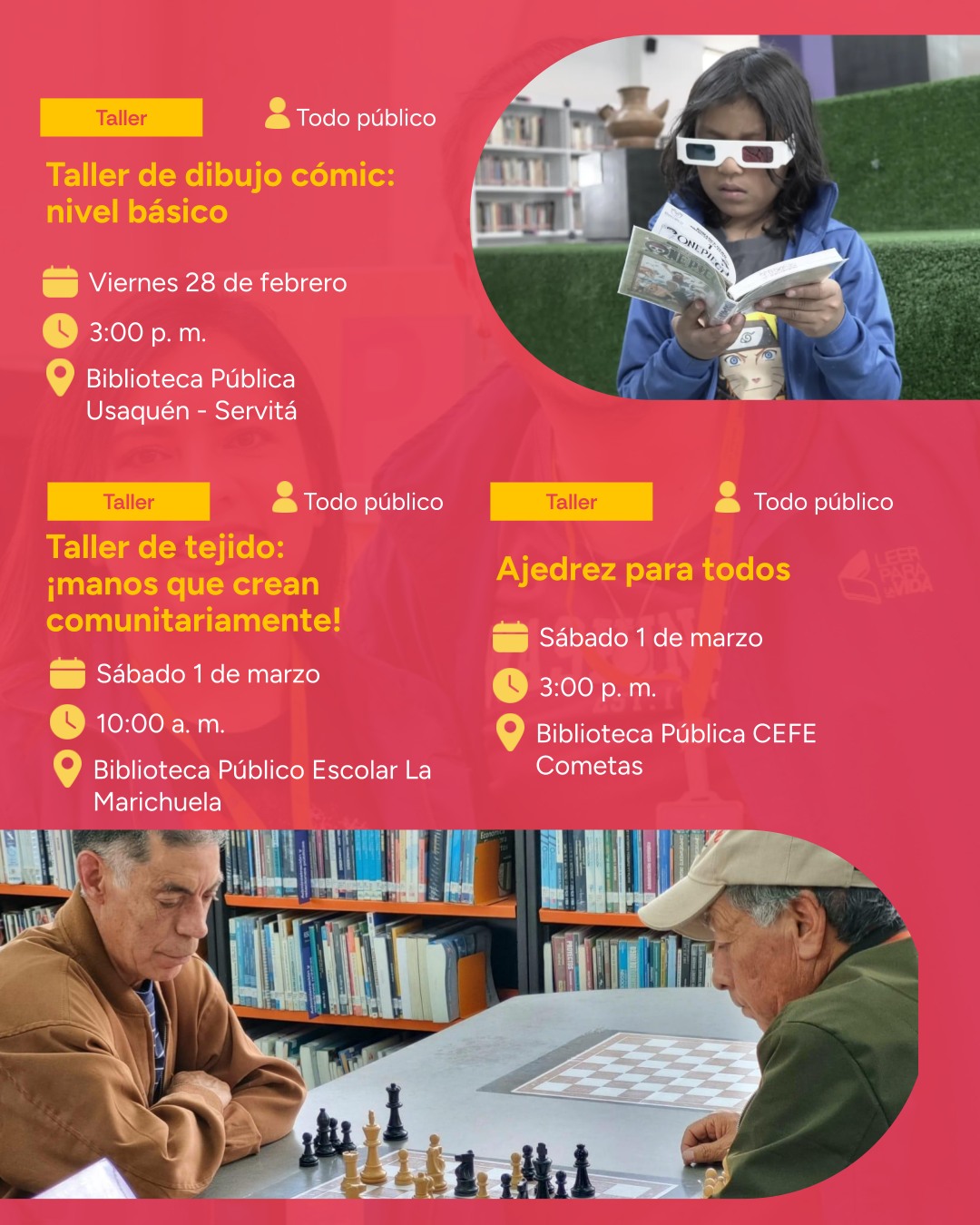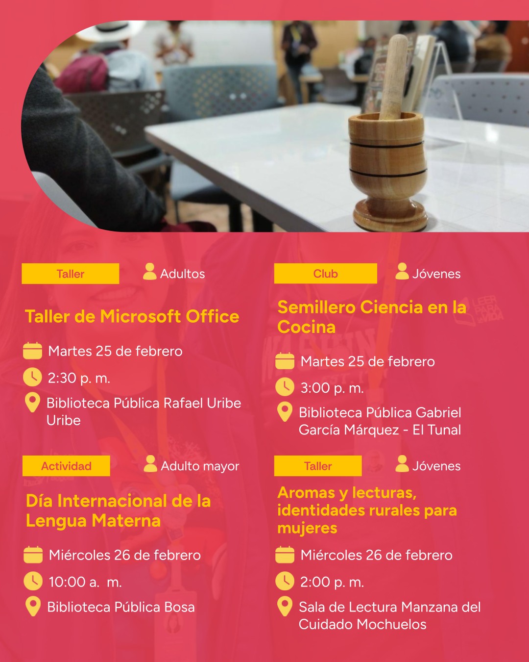 ¡En Bogotá, mi Ciudad, mi Casa, el 2025 es de grandes eventos y actividades culturales! La programación cultural de BibloRed continúa innovando con diferentes eventos para la participación de la comunidad usuaria en las bibliotecas públicas de Bogotá. Para esta semana del 25 de febrero al 2 de marzo de 2025, la Red de Bibliotecas Públicas de Bogotá (BibloRed) te trae talleres de informática, aprender sobre las lenguas nativas de Colombia, disfrutar de artes escénicas, talleres de dibujo, prácticas de ajedrez, clubes de lectura y cine foros.