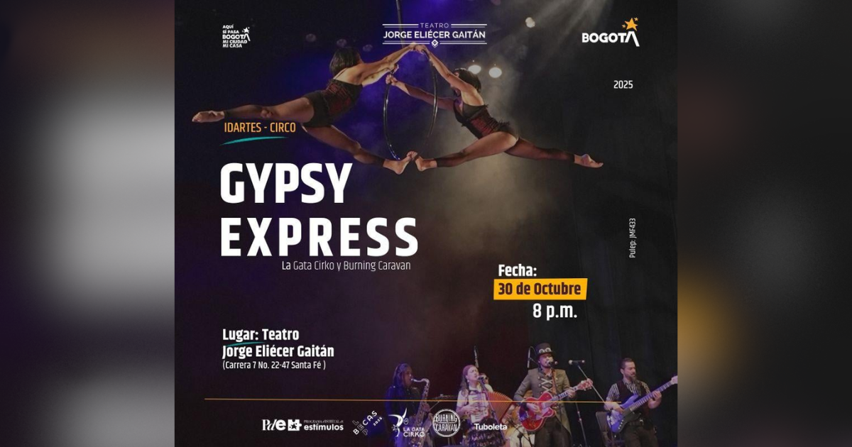 Bogotá, mi Ciudad, mi Casa y el Instituto Distrital de las Arte (Idartes) te trae 'Gypsy Express', un espectáculo de La Gata Cirko y Burning Caravan que nace de los recuerdos de Victor Koskorria, un antiguo Ring Master testigo de los días dorados de un circo que fue puro fuego, amor, vértigo y celebración,que se presentará en el Teatro Jorge Eliécer Gaitán el jueves 30 de octubre de 2025 a las 8:00 p. m. ¡Entrada con costo!