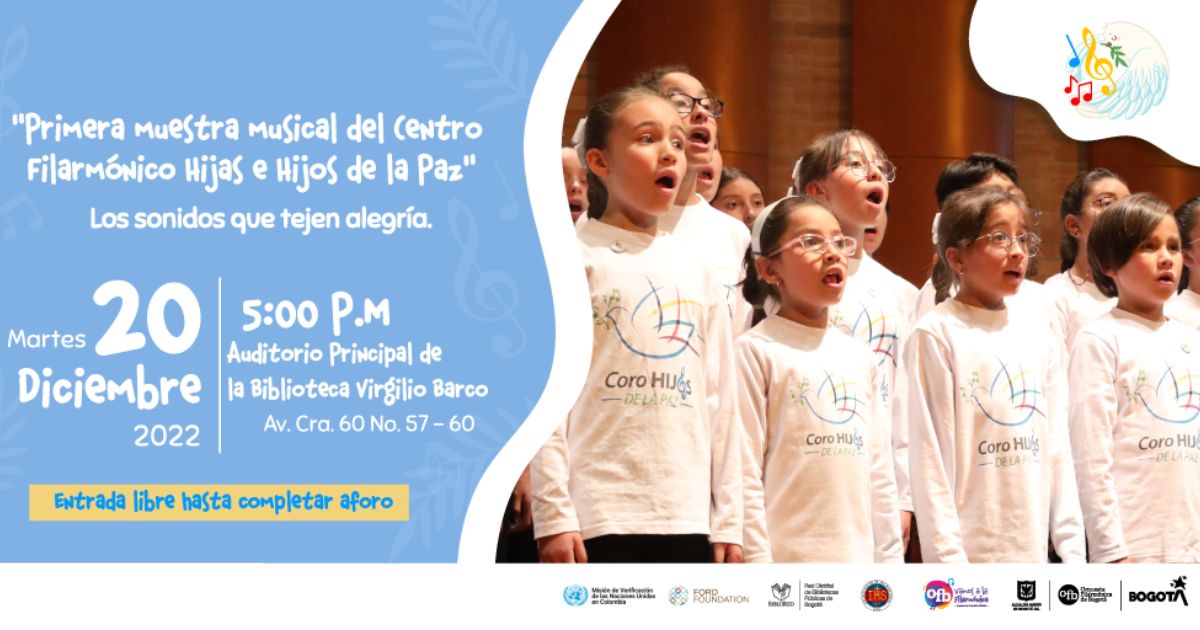 La Orquesta Filarmónica de Bogotá te invita a asistir a la primera muestra musical del Centro Filarmónico Hijas e Hijos de la Paz, este 20 de diciembre de 2022, en el auditorio de la Biblioteca Virgilio Barco ubicada en la Av. Cra. 60 No. 57 - 60.