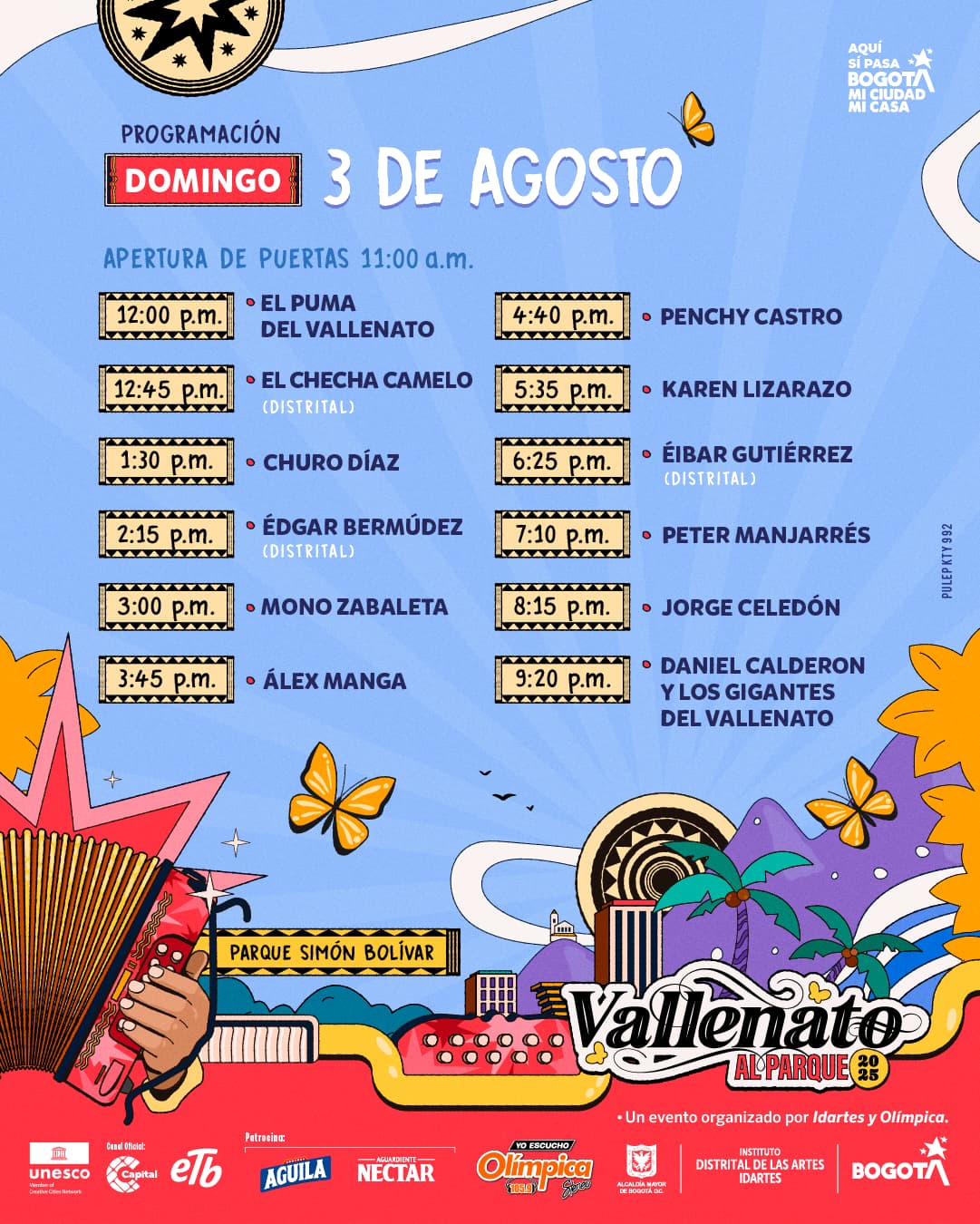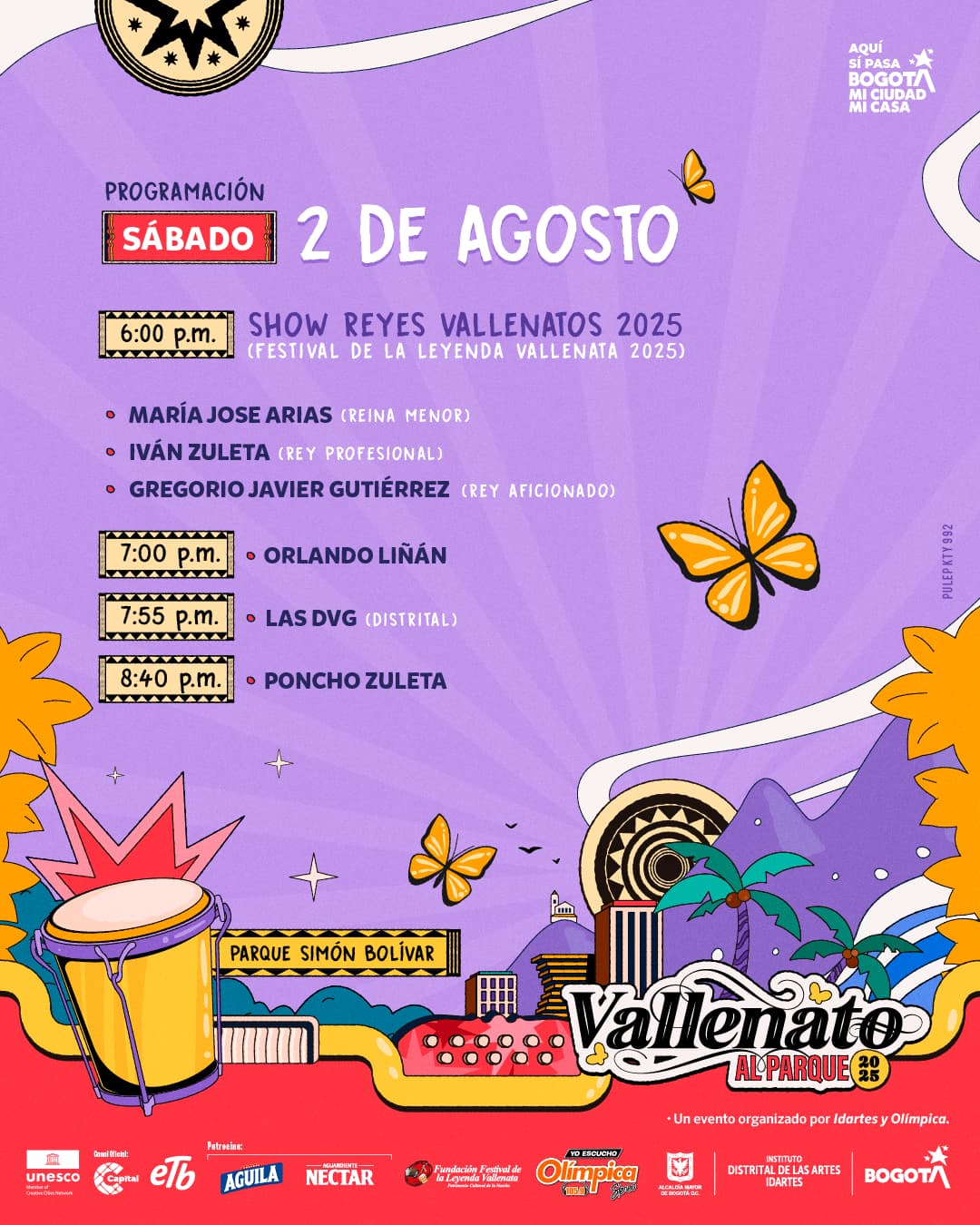 ¡Aquí sí pasa, Bogotá, mi Ciudad, mi Casa es sede de grandes eventos y conciertos! Este sábado 2 y domingo 3 de agosto,los bogotanos, bogotanas y visitantes podrán disfrutar de la segunda edición del Festival Vallenato al Parque 2025, el cual reunirá en el Parque Simón Bolívar a grandes representantes del género, nuevos talentos y artistas distritales que dan cuenta de la vitalidad del vallenato en la capital del país. La Alcaldía Mayor de Bogotá y el Instituto Distrital de las Artes (Idartes) presentan la programación diaria, conócela aquí