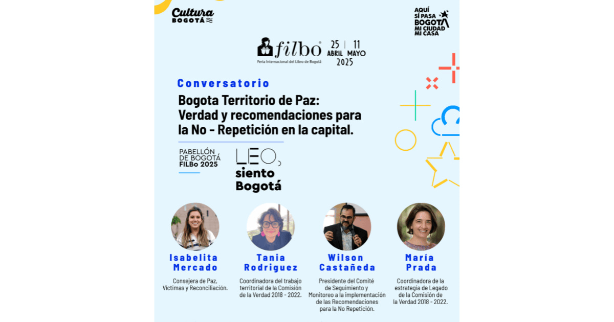 Este miércoles 30 de abril de 2025, asiste al panel 'Bogotá, territorio de paz – Verdad y Recomendaciones para la No-Repetición en la capital', un espacio liderado por la Consejería Distrital de Paz, Víctimas y Reconciliación en la Feria Internacional el Libro de Bogotá 2025 (FILBo), donde se abordará el conflicto armado interno en la ciudad y su impacto en la vida de las personas en la zona urbana y en la ruralidad.