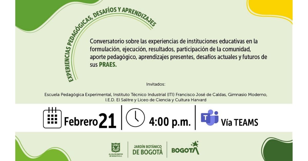 El Jardín Botánico de Bogotá te invita a participar este lunes, 21 de febrero, a las 4:00 p.m., en el conversatorio virtual dedicado a las experiencias de instituciones educativas en la formulación, ejecución, medición de resultados y desafíos en la implementación de los Proyectos Ambientales Escolares, PRAES.