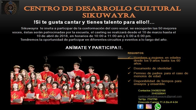 El Centro de Desarrollo Cultural Sikuwayra invita a los ciudadanos que practiquen el arte del canto y la interpretación vocal a participar de la conformación del coro de la organización, a partir del 10 de marzo, donde se escogerán las 50 mejores voces que serán patrocinadas por la escuela, con ayuda de la Secretaría de Cultura, Recreación y Deporte.