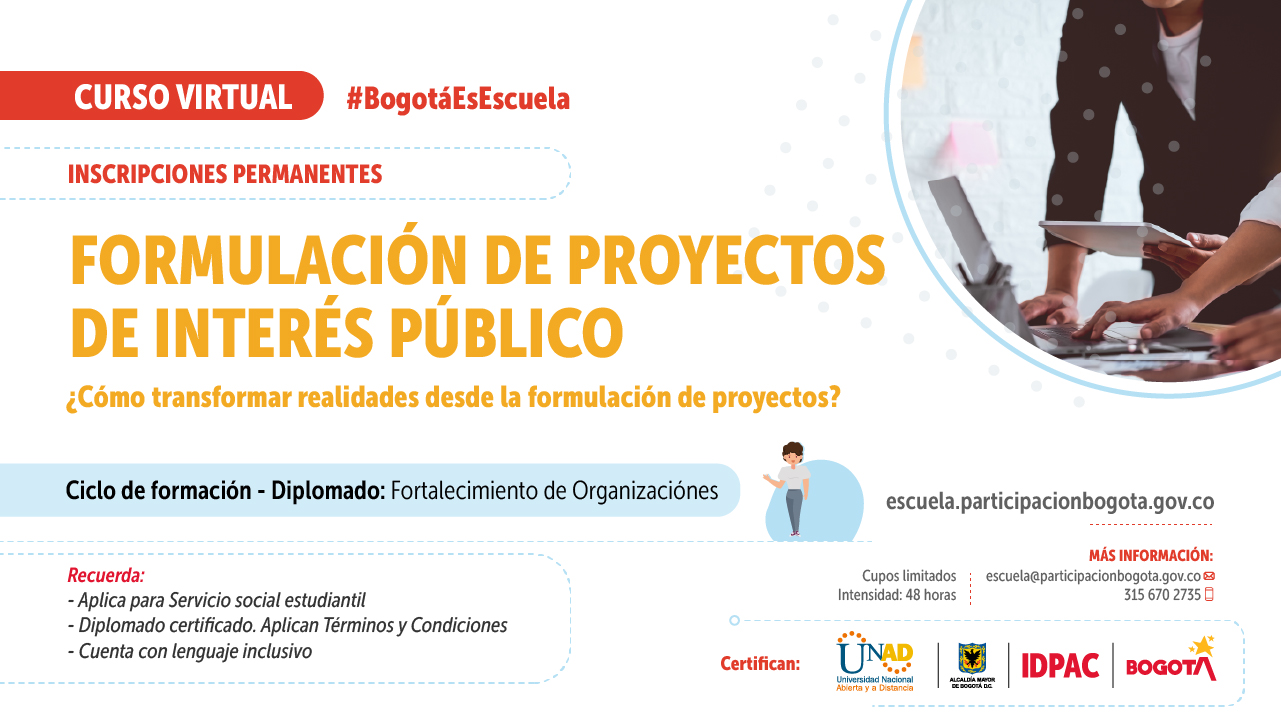 Tiene como propósito fortalecer habilidades para la formulación de proyectos a través de la implementación de metodologías innovadoras y colaborativas que permitan promover la participación comunitaria y su vinculación a escenarios de construcción social.