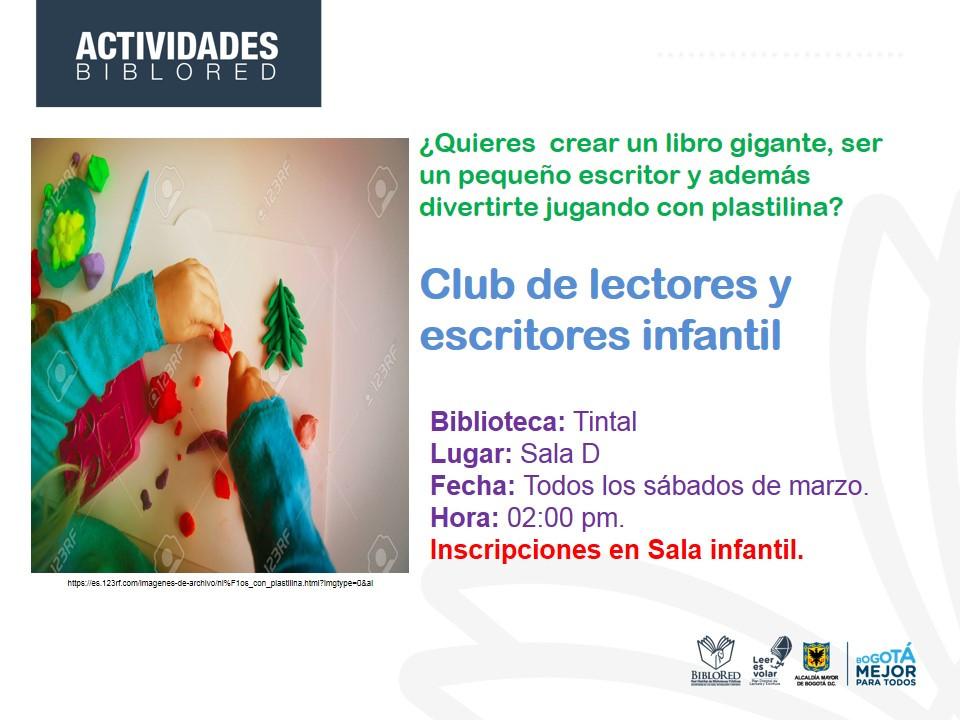 ¡Crea un libro gigante, sé un pequeño escritor y además diviértete jugando con plastilina! Participa en el Club de Lectores y escritores para que te diviertas aprendiendo. Inscripciones previas en la Biblioteca Pública El Tintal Manuel Zapata Olivella-Sala infantil, ubicada en la Ak. 86 #6c-09. Entrada libre. Todos los sábados de marzo.