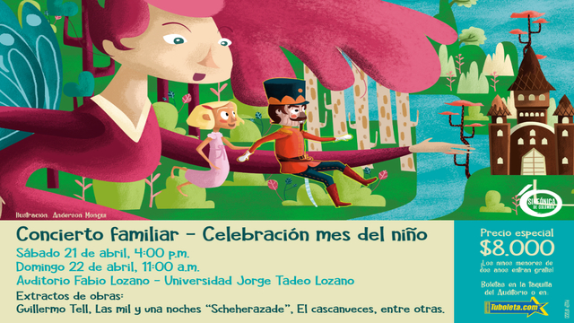 La Orquesta Sinfónica Nacional de Colombia celebra el mes del niño,con los conciertos familiares que se llevarán a cabo el sábado 21 de abril a las 4:00 pm y el domingo 22 de abril a las 11:00 am en el Auditorio Fabio Lozano de la Universidad Jorge Tadeo Lozano de Bogotá, ubicado en la Carrera 4A # 22-40 Bogotá.