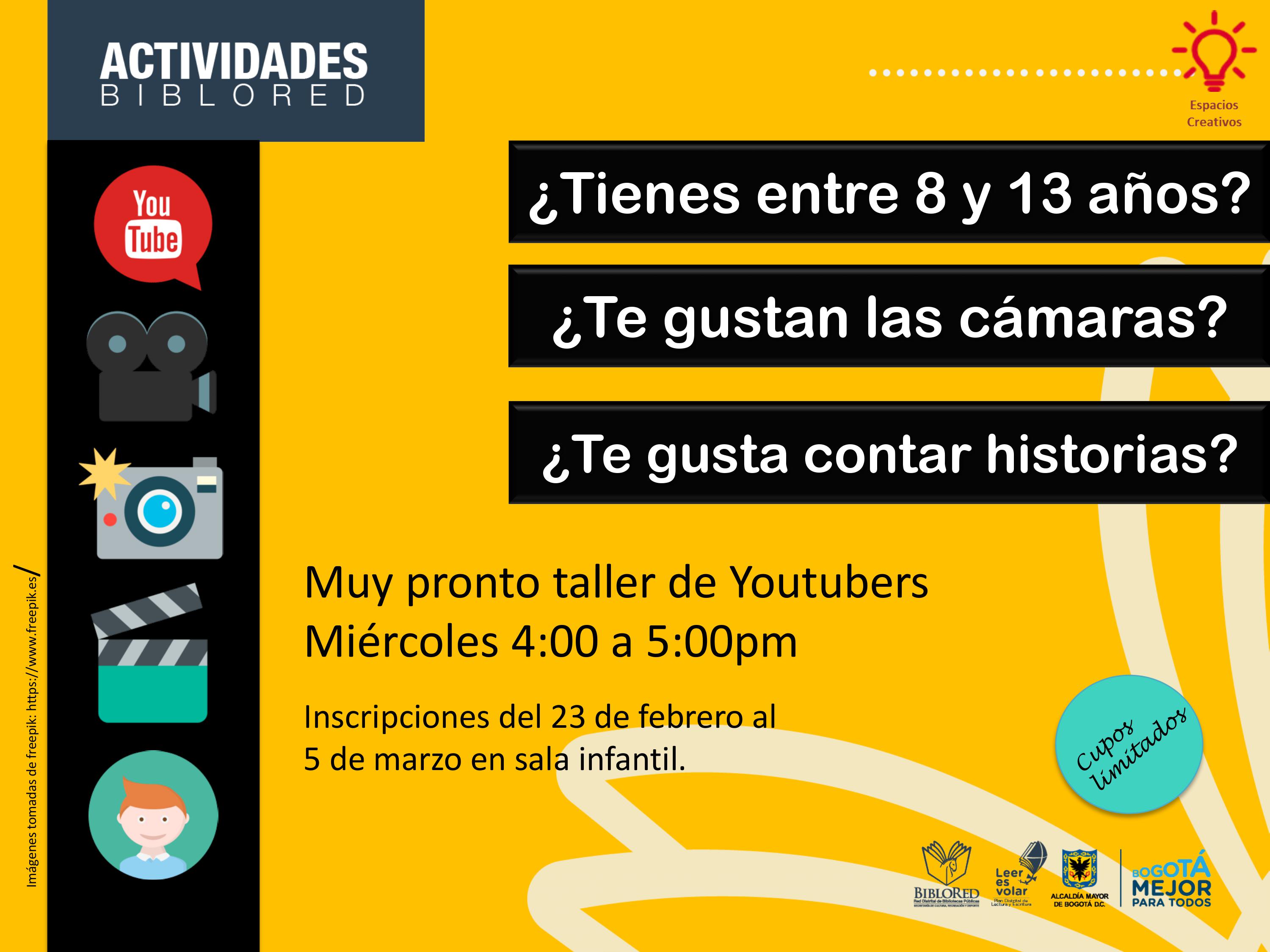 ¿Tienes entre 8 y 13 años? ¿Te gustan las cámaras y contar historias? Inscríbete hasta el próximo lunes 5 de marzo al taller en la sala infantil de la Biblioteca El Tintal, ubicada en la Ak. 86 #6c-09. Cupos limitados. Entrada libre.