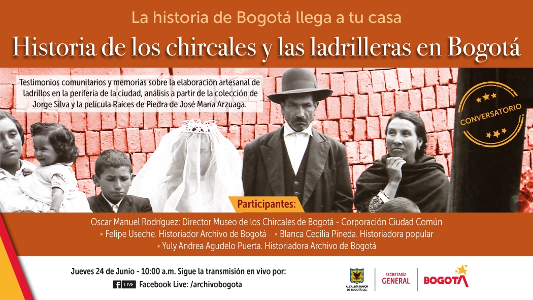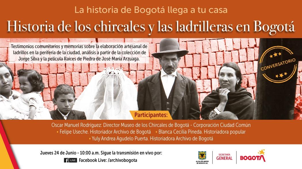 En el marco de los conversatorios 'La Historia de Bogotá llega a tu casa', que viene transmitiendo la Secretaría General de la Alcaldía Mayor, a través del Archivo de Bogotá, por Facebook Live, este jueves 24 de junio, a las 10:00 a.m., se desarrollará: Historia de los chircales y las ladrilleras en Bogotá, en el que se abordarán testimonios comunitarios y memorias sobre la elaboración artesanal de ladrillos en la periferia de la capital colombiana.