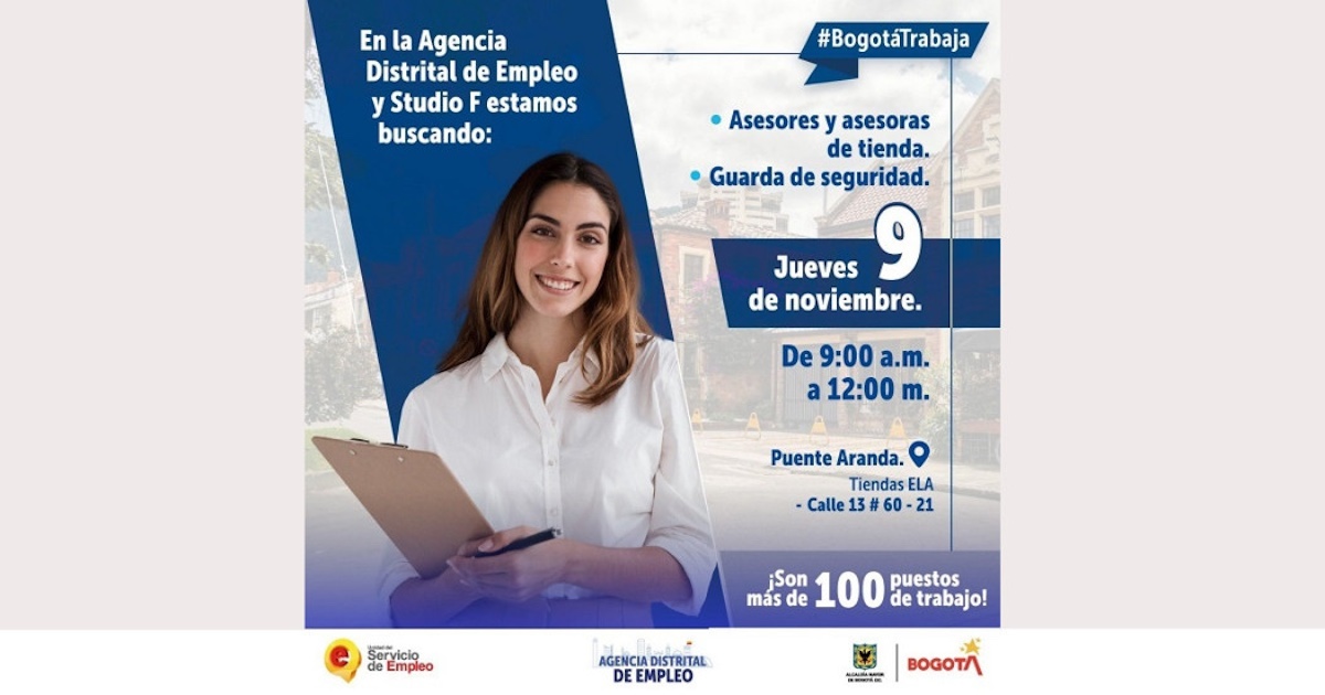 Esta feria de empleo tendrá lugar en la localidad de Puente Aranda (calle 13 # 60-21. Tiendas ELA), en donde se requiere emplear a: