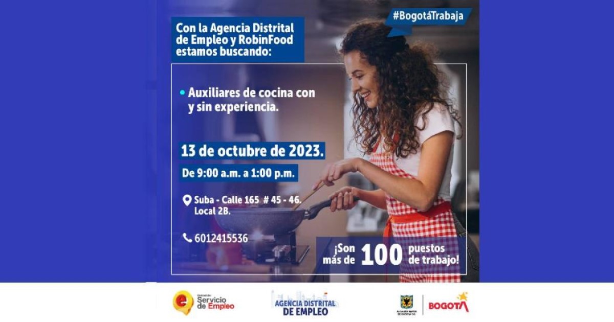 Durante esta feria se requiere emplear a 100 puestos de trabajo como auxiliares de cocina con o sin experiencia.