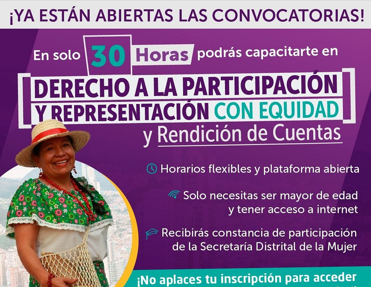 Curso gratuito que brindará información relacionada con derecho a la participación y representación de equidad. Otorgando al finalizar una constancia de participación de la Secretaría Distrital de la Mujer.