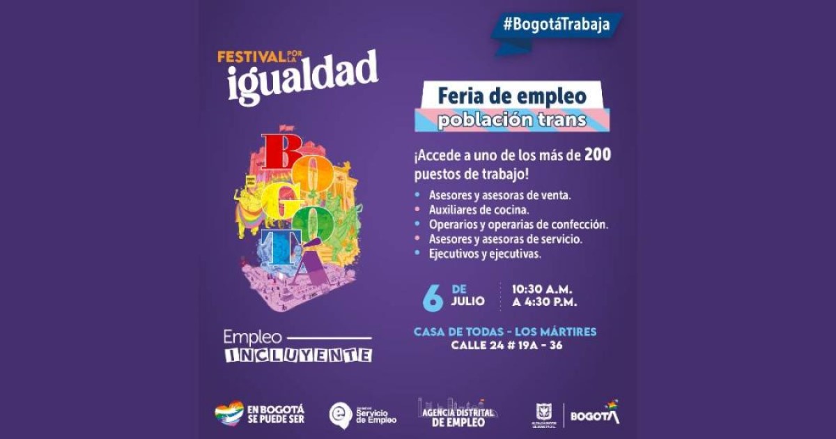 En Bogotá se puede ser y por ello la Secretaría de Desarrollo Económico te invita a participar en la feria de empleo para población trans que se llevará a cabo este jueves 6 de junio.
