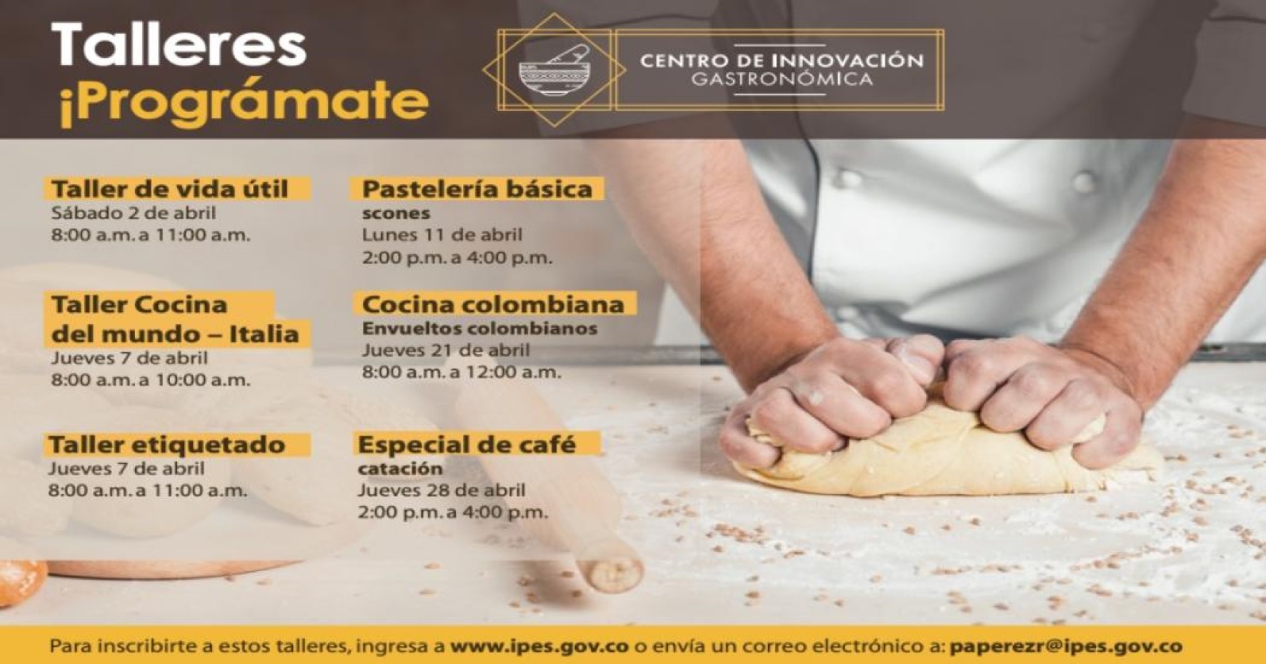 La Alcaldía Mayor de Bogotá y el Instituto para la Economía Social -IPES, extienden la invitación para que, emprendedores de las unidades productivas de alimentos y comerciantes de las plazas distritales de mercado, conozcan y participen en los talleres que se llevarán a cabo en el Centro de Innovación Gastronómica durante el mes de abril