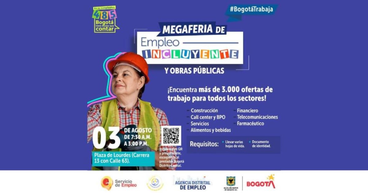 Como parte de la celebración de los 485 años de Bogotá, la Administración Distrital a través de la Secretaría de Desarrollo Económico realizará la Megaferia de Empleo Incluyente y Obras Públicas, en la que ofrecerá 3.000 oportunidades laborales.
