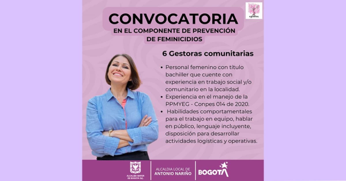 La convocatoria estará abierta hasta el 7 de marzo, solamente debes enviar la hoja de vida actualizada convocatoriamujeresan@gmail.com si cumples los requisitos. De igual forma, puedes llevarla el miércoles 6 de marzo de 9:00 a.m. a 1:00 p.m. en la Alcaldía Local de Antonio Nariño.