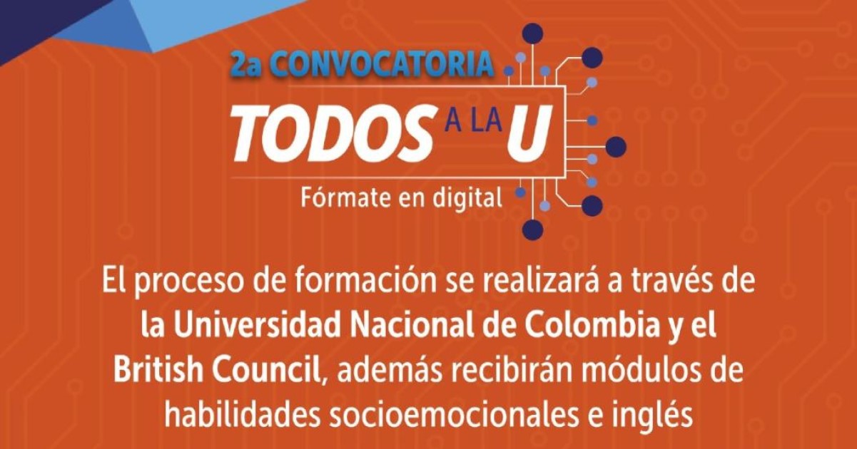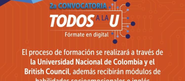 Como parte de esta iniciativa se otorgarán 4.000 becas para cursos de formación para el trabajo, dirigidos al sector digital. Para acceder a este beneficio las personas interesadas deberán registrarse a partir del 28 de febrero hasta el 24 de marzo en el enlace https://agenciaatenea.gov.co/convocatorias/segunda-convocatoria-todos-la-u.