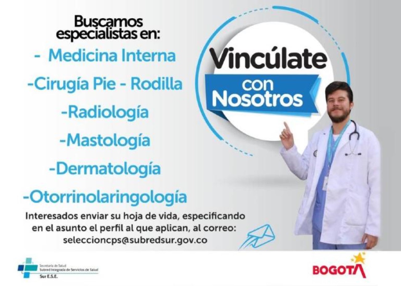 Los interesados podrás enviar su hoja de vida al correo seleccioncps@subredsur.gov.co