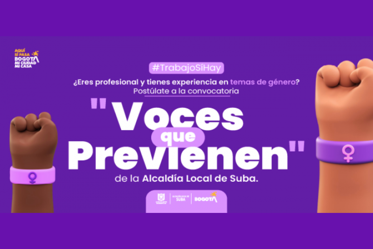 ¡En ‘Bogotá, mi Ciudad, mi Casa’ trabajo sí hay! La Alcaldía Local de Suba invita a profesionales interesados en trabajar por la equidad de género a participar en la convocatoria 'Voces que Previenen', una estrategia que busca conformar un equipo técnico con enfoque social y comunitario para liderar procesos de sensibilización, articulación y fortalecimiento de la Política Pública de Mujeres y Equidad de Género (PPMYEG) en la localidad.